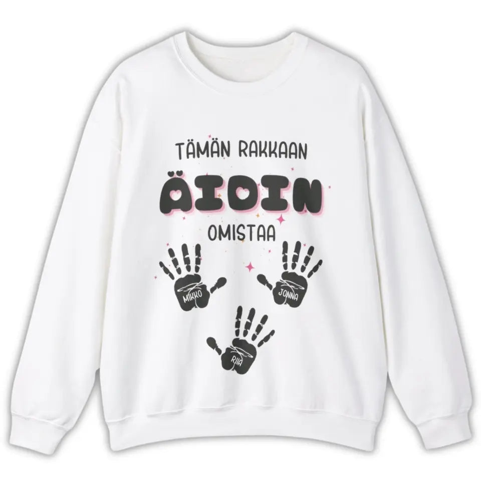 Personoitu collegepaita äidille – lasten nimet kädenjäljissä