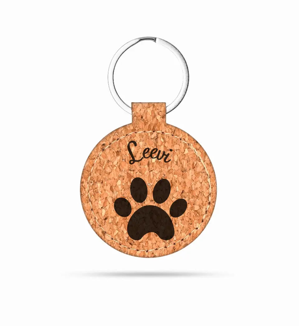 Persoonallinen korkkinen avaimenperä lemmikkisi nimellä ja tassunjäljellä