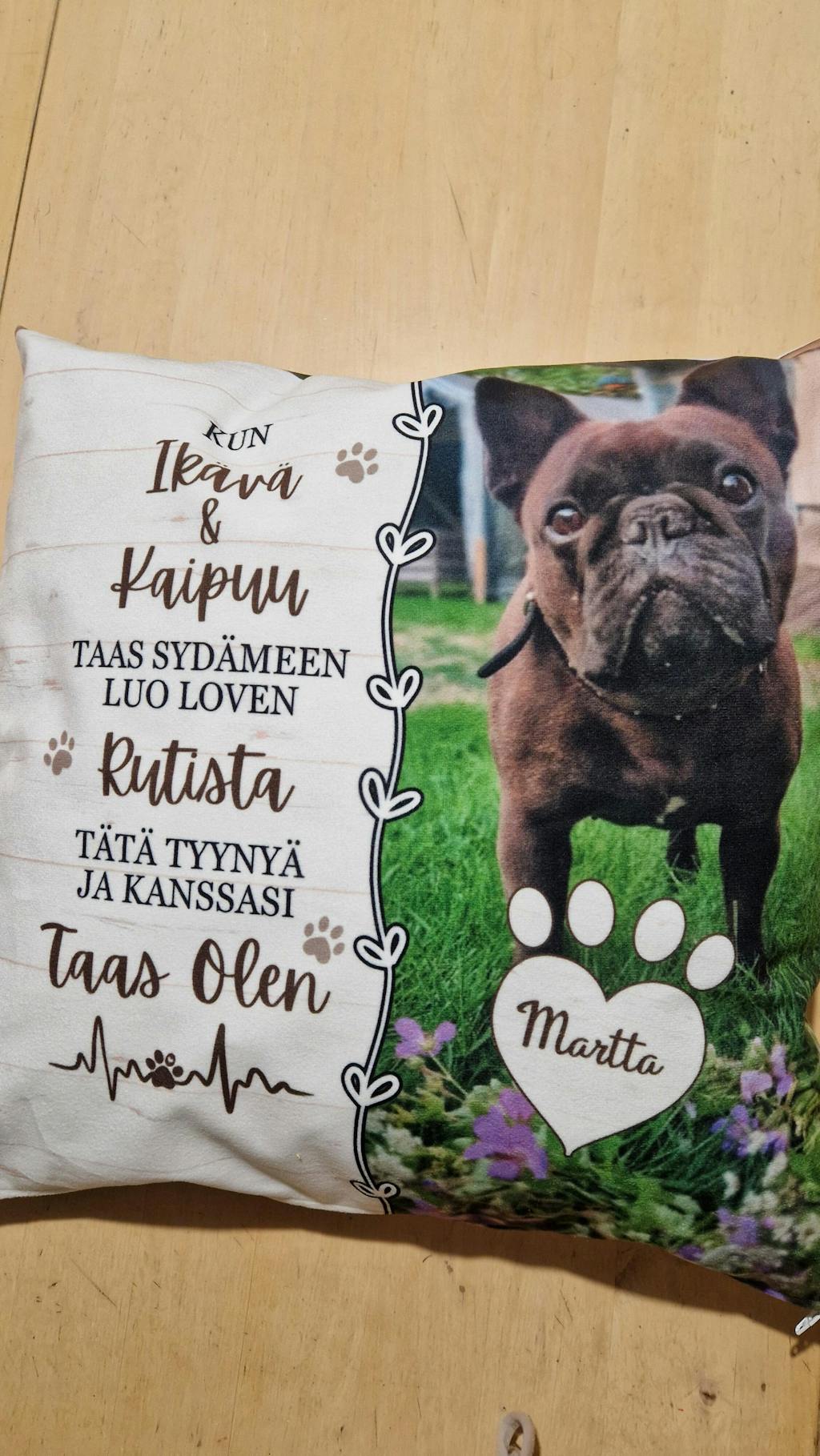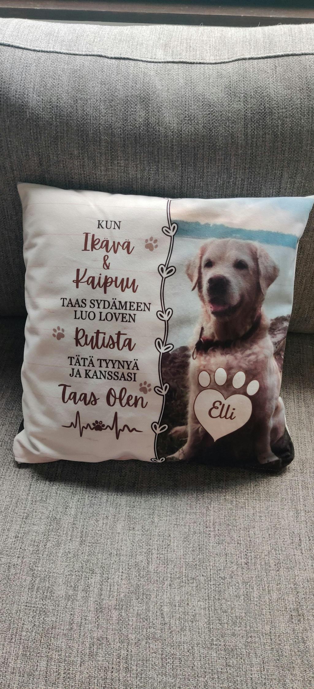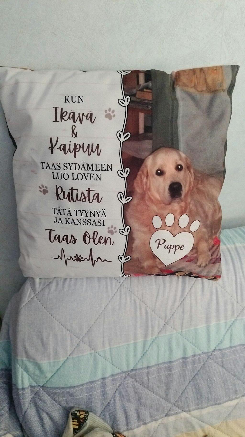 Ihana, hyvälaatuisen tuntuinen tyyny rakkaan lemmikkini muistolle. Materiaali kivan pehmoinen ja kuva tehty niin että varmasti on pysyvä. Tyynynpäällisessä on vielä vetoketju jolloin saa sisätyynyn tarvittaessa vaihdettua.