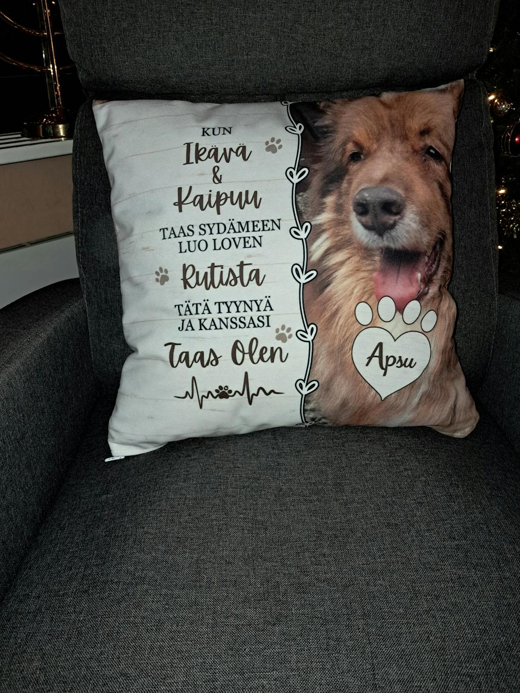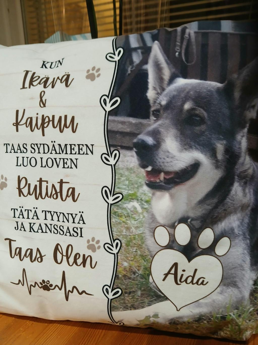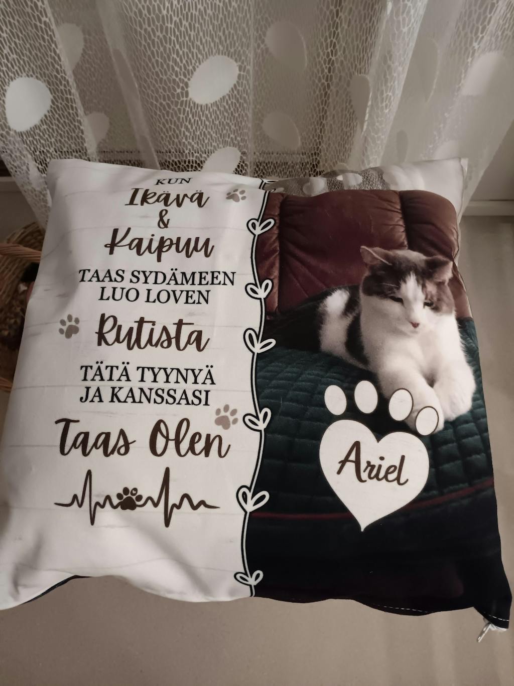 Ihana, hyvälaatuisen tuntuinen tyyny rakkaan lemmikkini muistolle. Materiaali kivan pehmoinen ja kuva tehty niin että varmasti on pysyvä. Tyynynpäällisessä on vielä vetoketju jolloin saa sisätyynyn tarvittaessa vaihdettua.