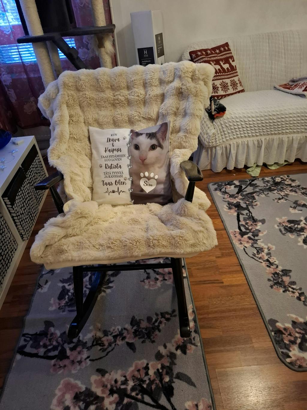 Pienen odottelun jälkeen tilaukseni saapui perille. On juuri sellainen persoonallinen tyyny oman kissani kuvalla että en tiedä raskinko kääriä lahjapakettiin vai pidänkö itselläni.