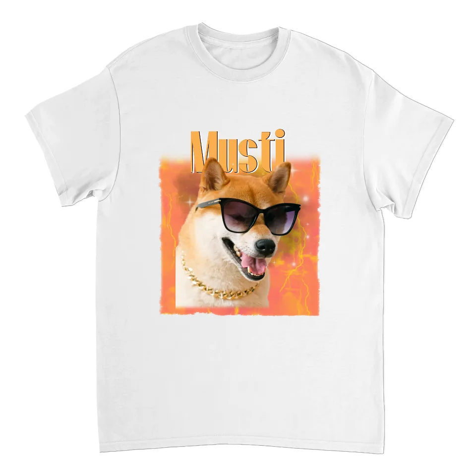 Tässäpä vasta tyylinäyte, joka saa kaikki hymyilemään! Kuvittele oma karvainen perheenjäsenesi suosikkibändin fanipaidassa – aurinkolasit silmillä ja asenne kohdillaan. 😎🐶😸